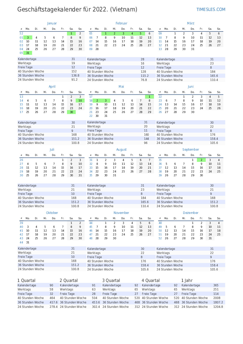 Laden Sie den PDF-Werktagskalender mit Feiertagen und Wochenenden für das 2. Quartal 2022 für Vietnam herunter und drucken Sie ihn aus