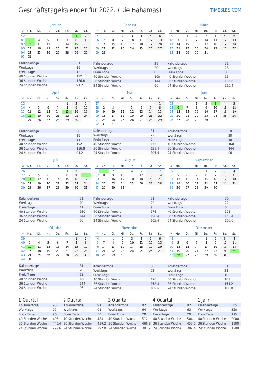 Für das 3. Quartal 2022 gibt es auf den Bahamas 4 Feiertage und freie Tage. Das 3. Quartal 2022 beginnt am am Freitag und endet am am Freitag.