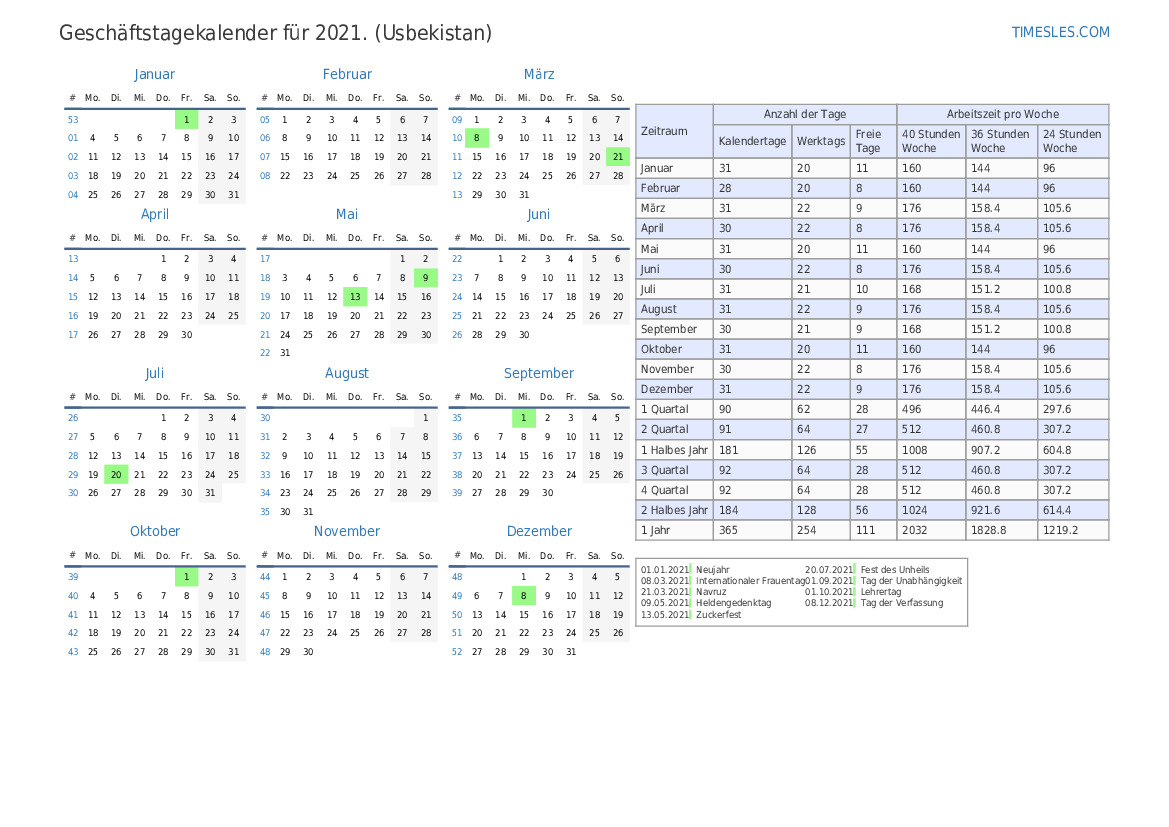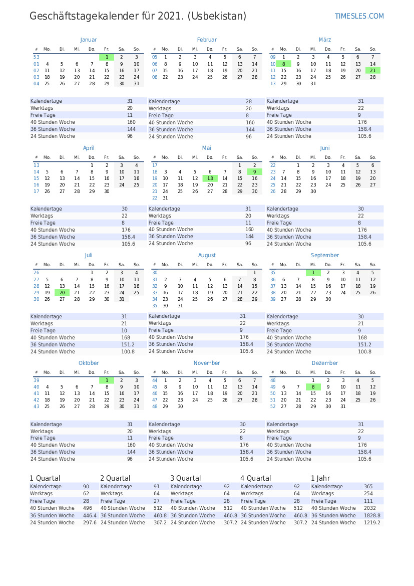 Ruhetage für Mai 2021. Für Mai 2021 gibt es in Usbekistan 2 Feiertage und freie Tage.