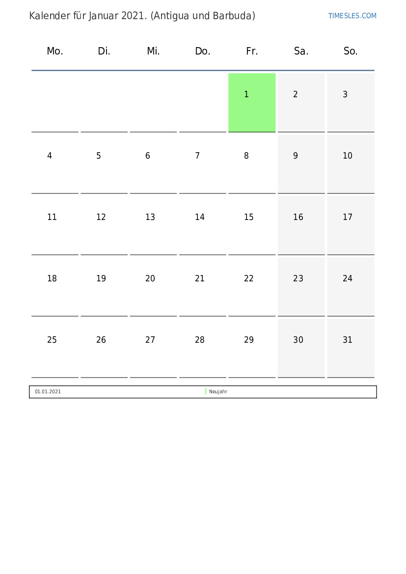 Feiertags- und Wochenendkalender für Januar 2021 für Antigua und Barbuda