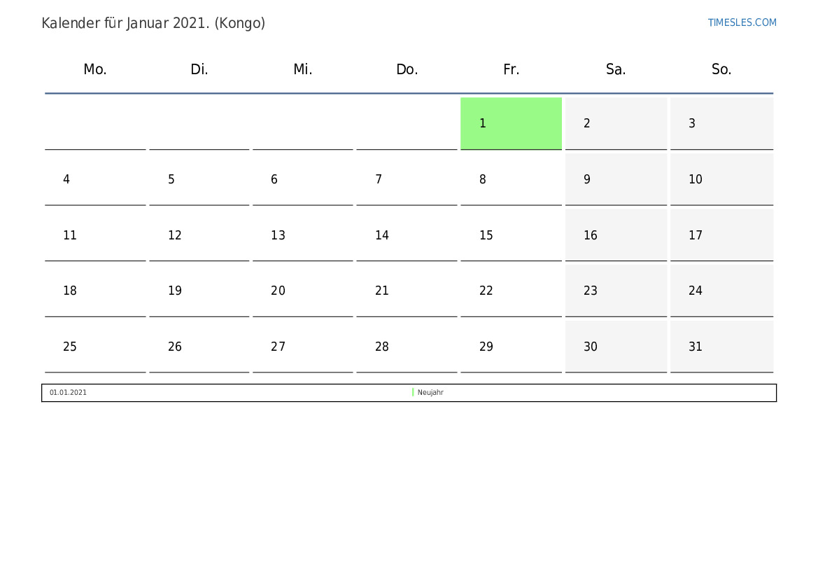 Feiertags- und Wochenendkalender für Januar 2021 für den Kongo