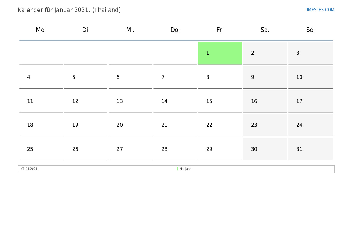Feiertags- und Wochenendkalender für Januar 2021 für Thailand