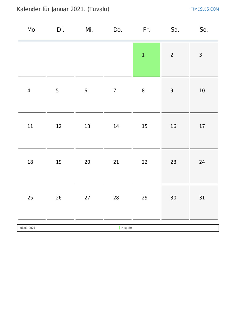 Feiertags- und Wochenendkalender für Januar 2021 für Tuvalu
