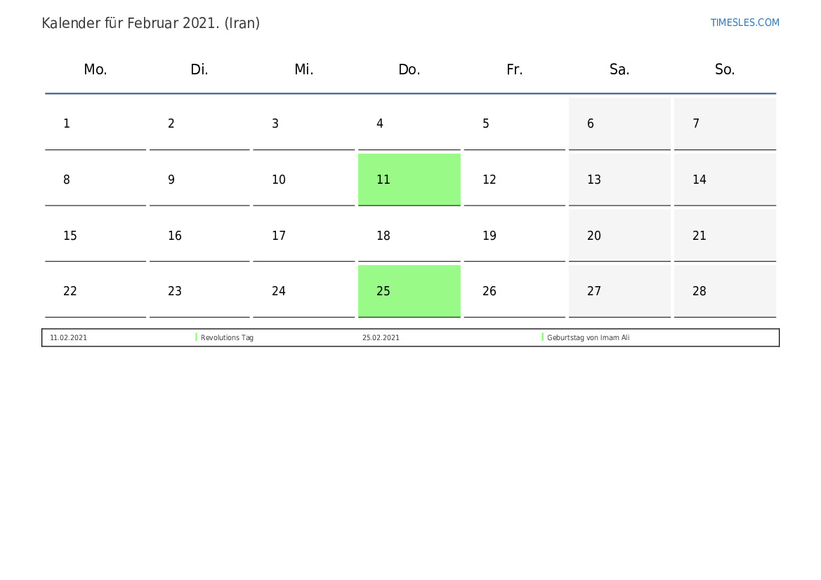 Feiertags- und Wochenendkalender für Februar 2021 für den Iran
