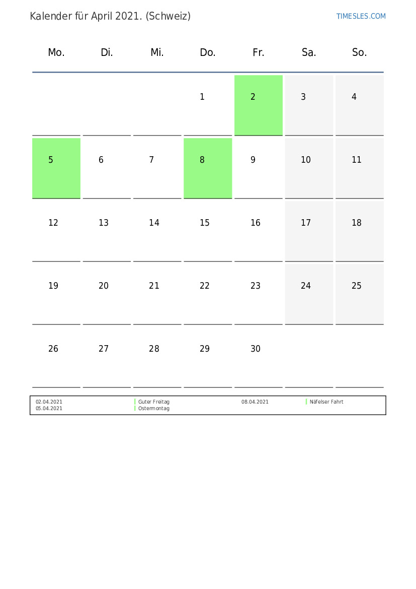 Laden Sie den PDF-Kalender mit Feiertagen und Wochenenden für April 2021 für die Schweiz herunter und drucken Sie ihn aus