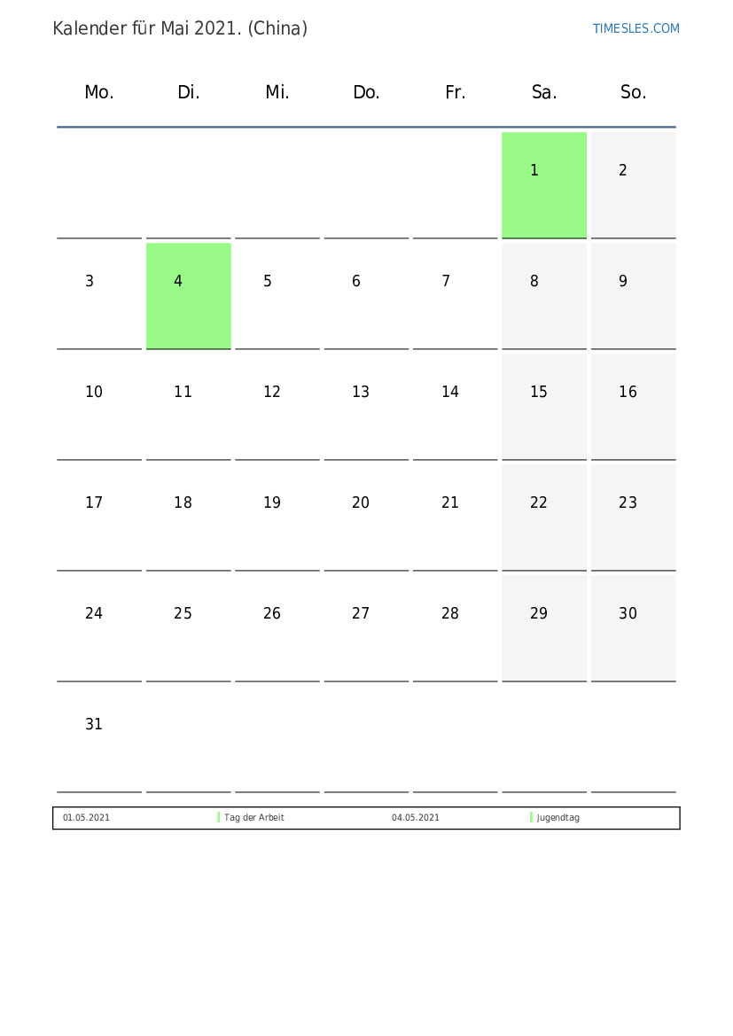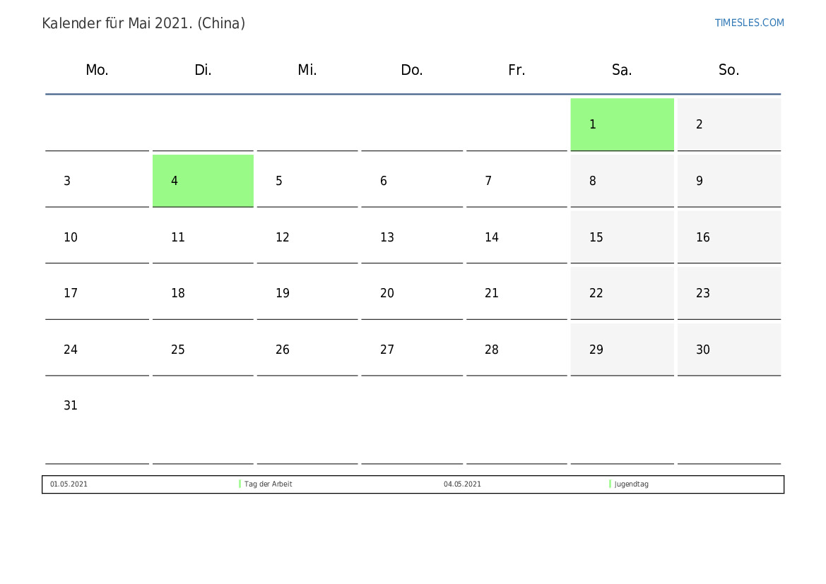 Feiertags- und Wochenendkalender für Mai 2021 für China