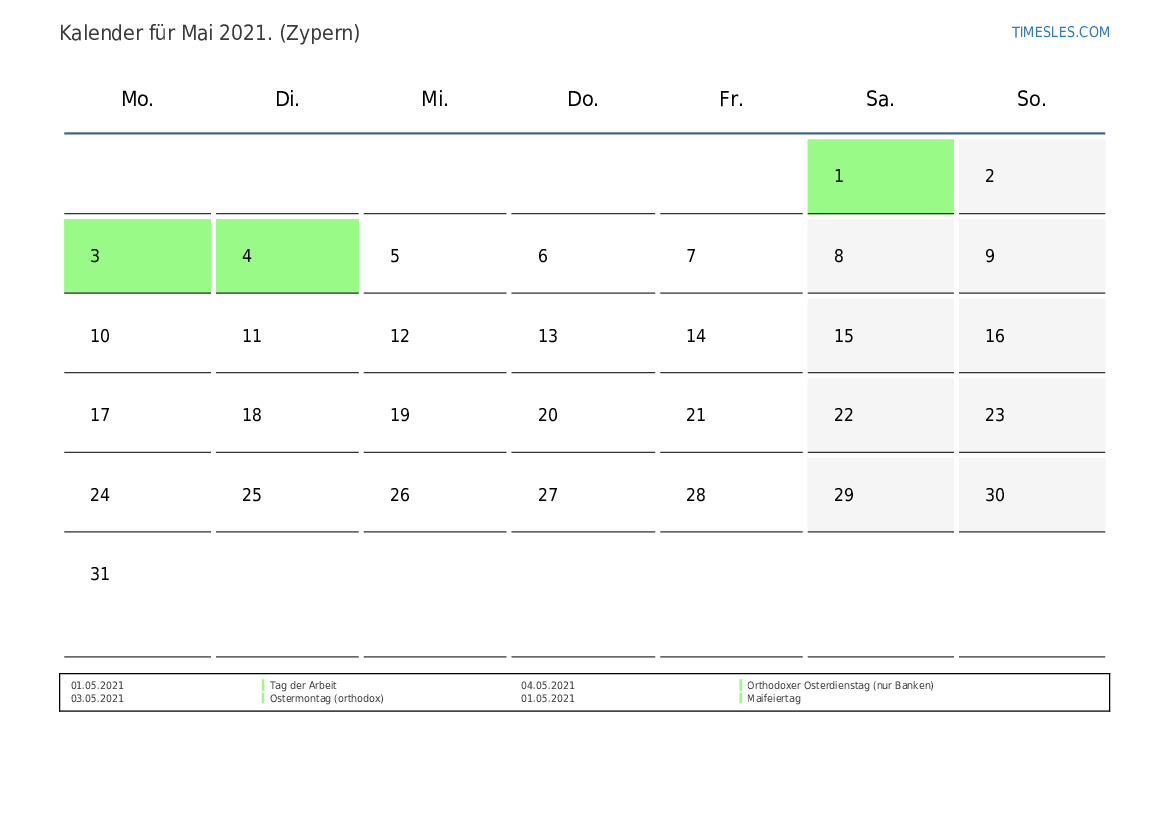 Laden Sie den PDF-Kalender mit Feiertagen und Wochenenden für Mai 2021 für Zypern herunter und drucken Sie ihn aus