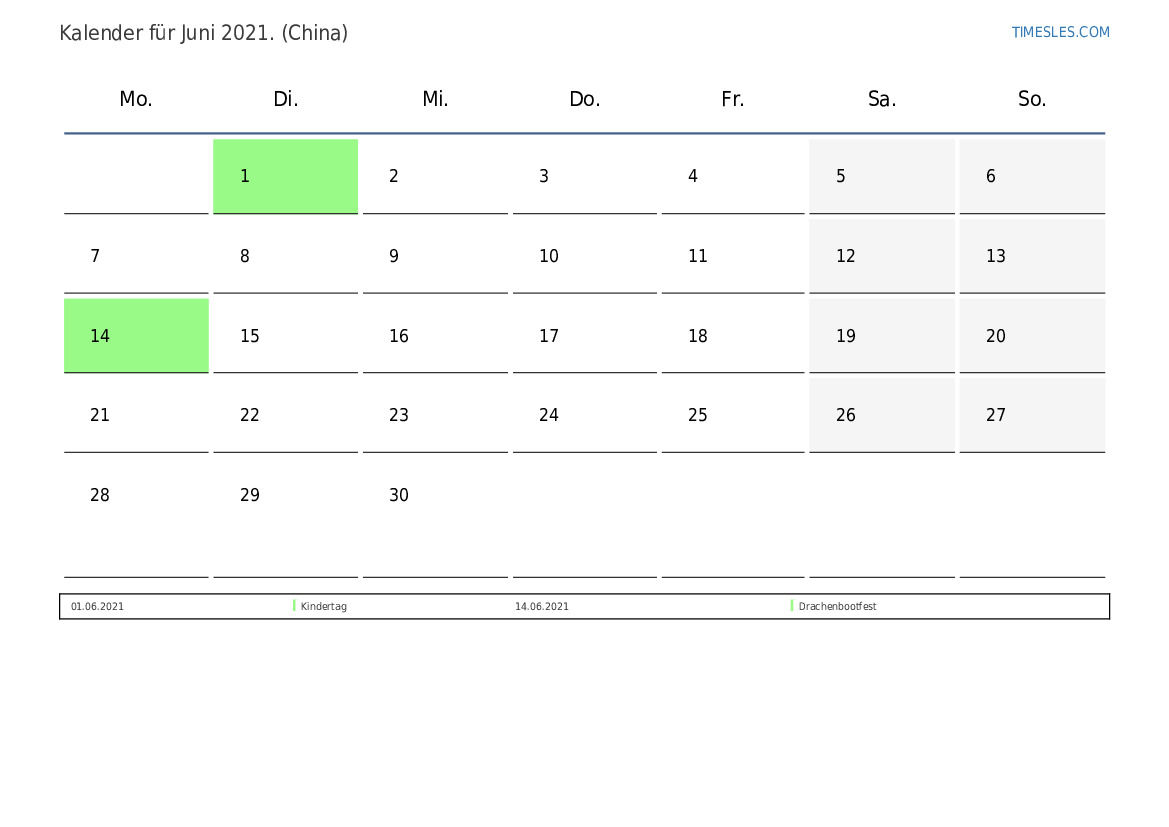 Feiertags- und Wochenendkalender für Juni 2021 für China