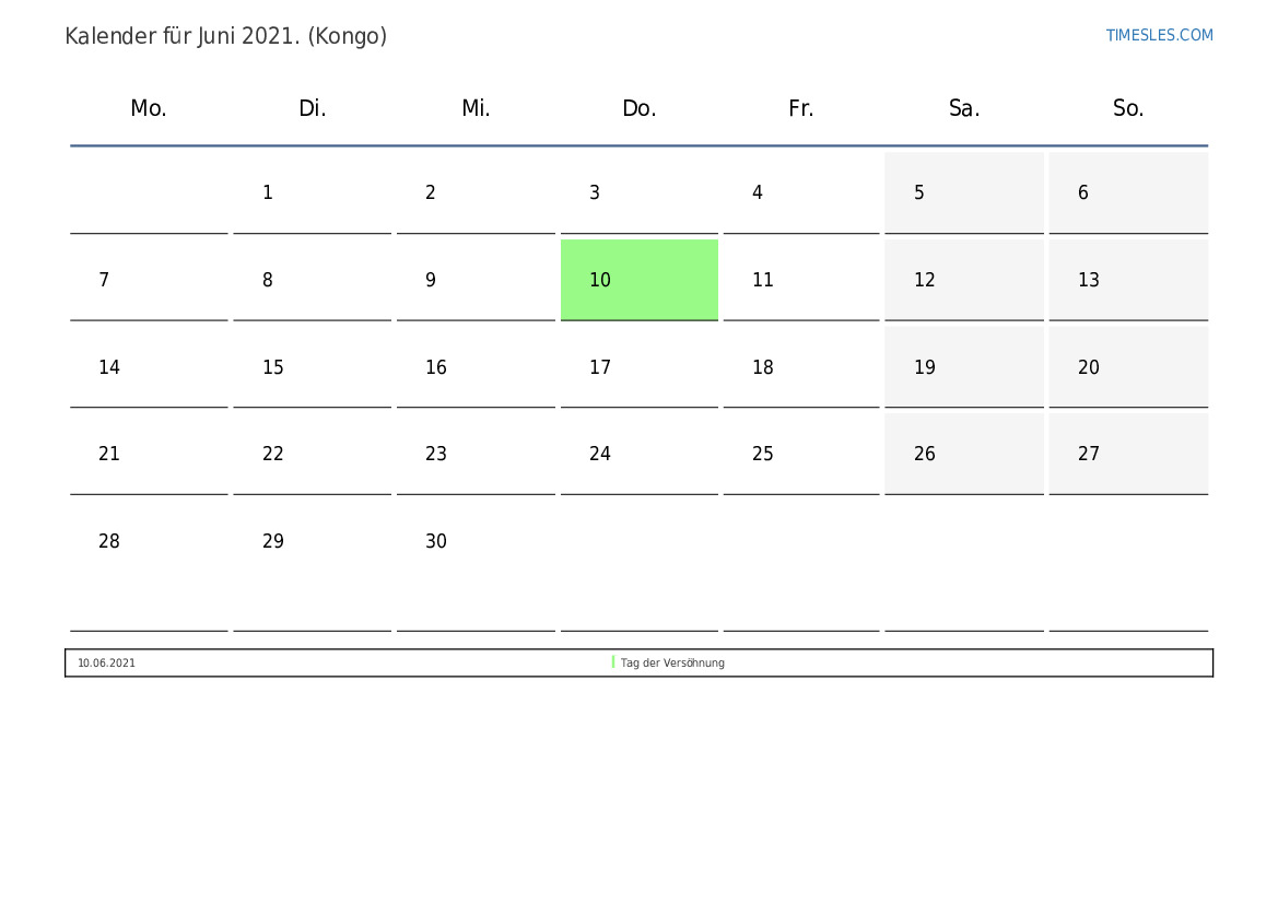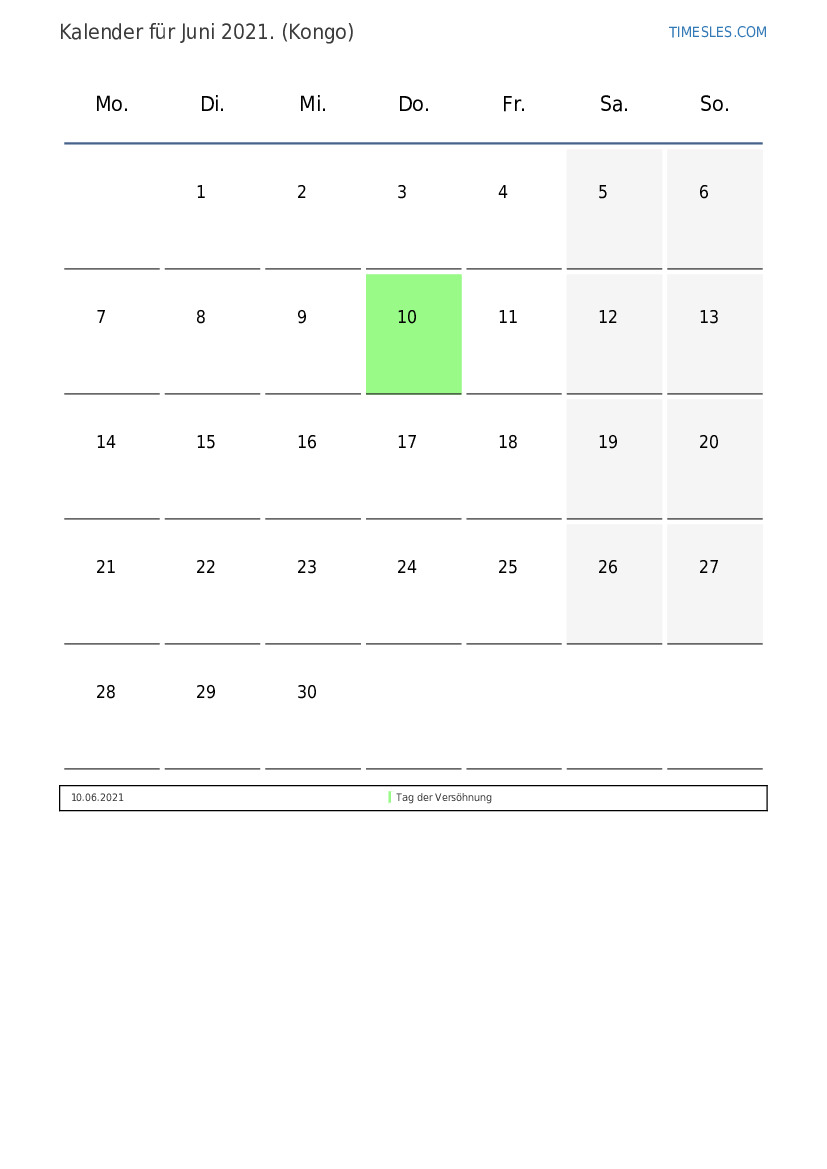 Laden Sie den PDF-Kalender mit Feiertagen und Wochenenden für Juni 2021 für den Kongo herunter und drucken Sie ihn aus