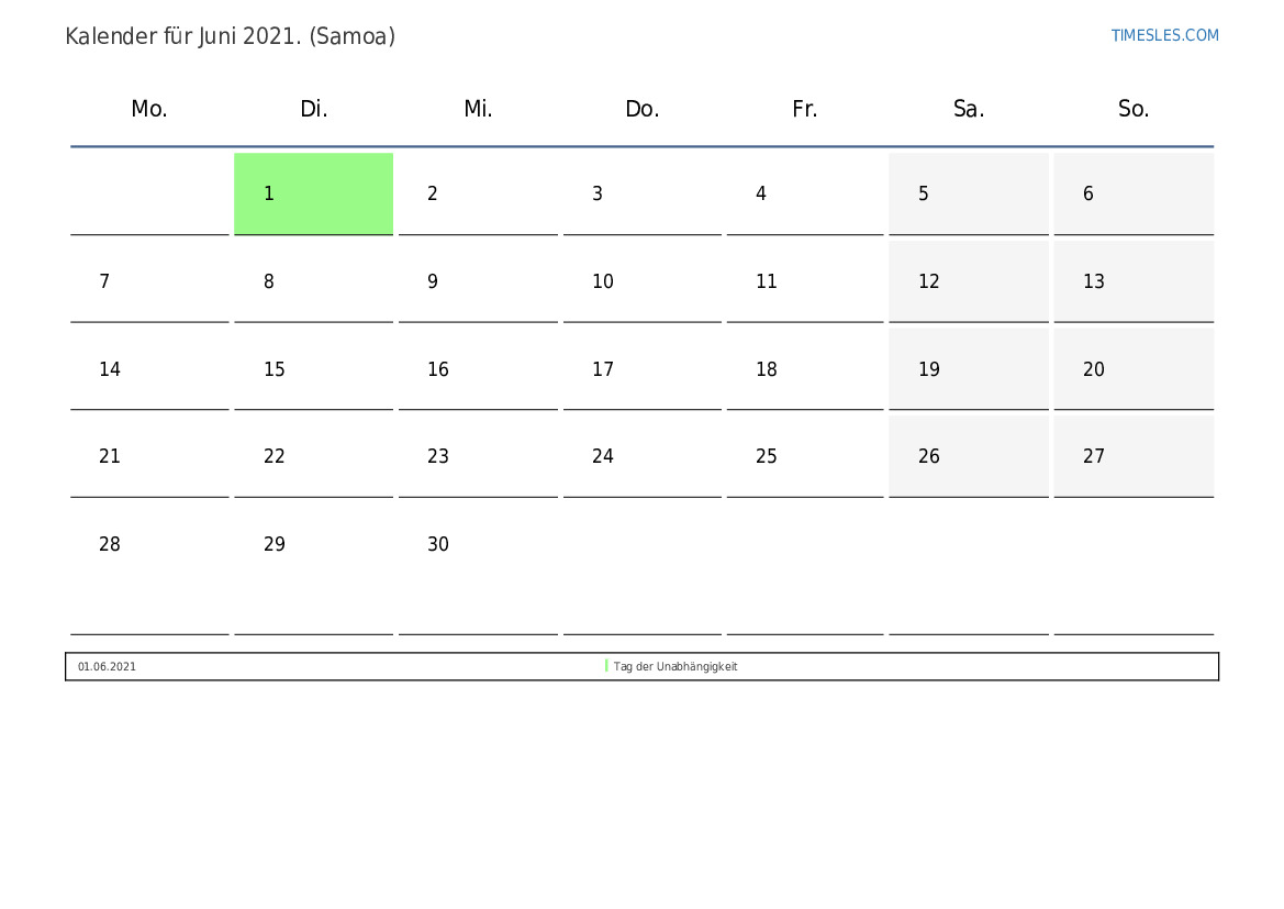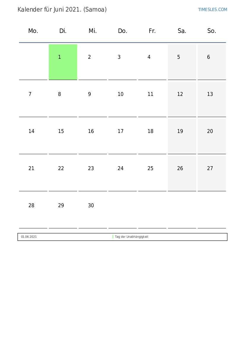 Feiertags- und Wochenendkalender für Juni 2021 für Samoa