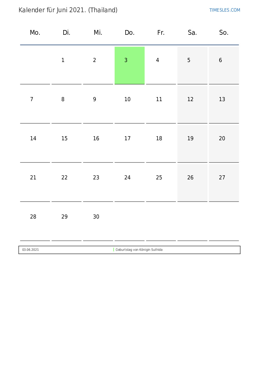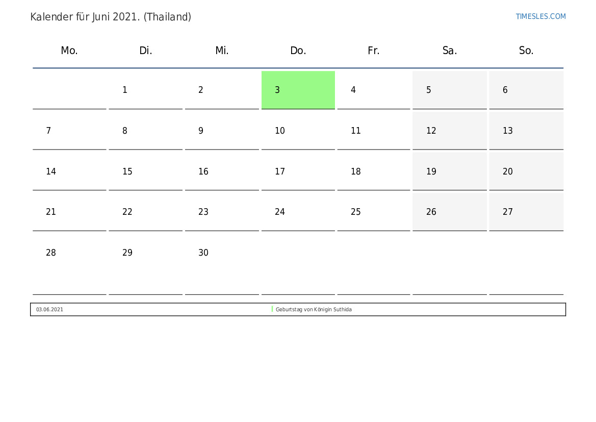 Laden Sie den PDF-Kalender mit Feiertagen und Wochenenden für Juni 2021 für Thailand herunter und drucken Sie ihn aus