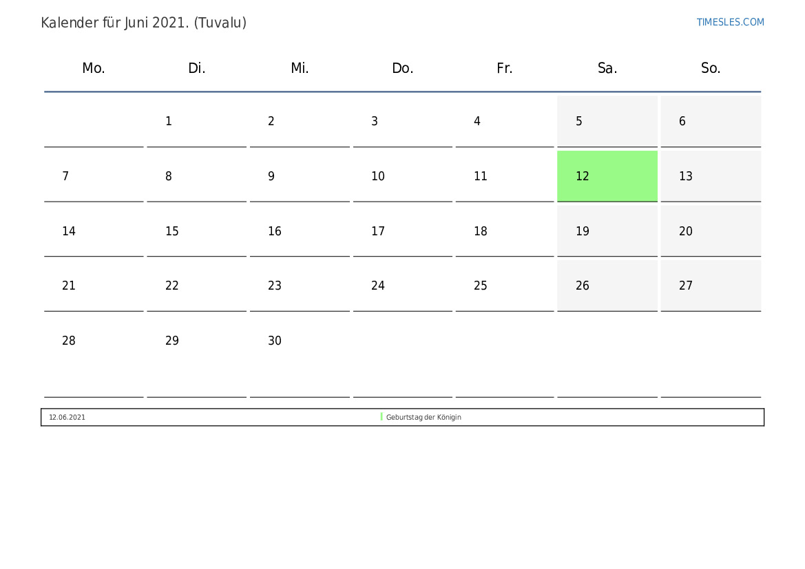 Feiertags- und Wochenendkalender für Juni 2021 für Tuvalu