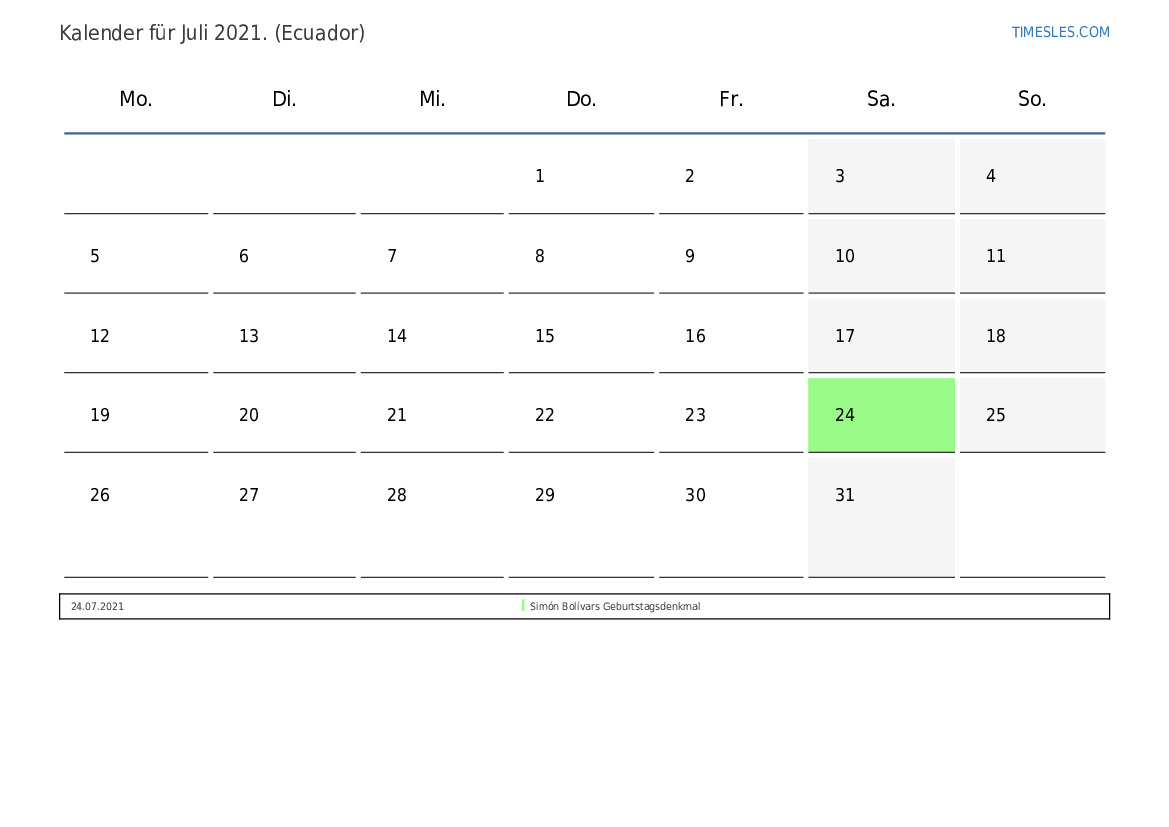 Feiertags- und Wochenendkalender für Juli 2021 für Ecuador