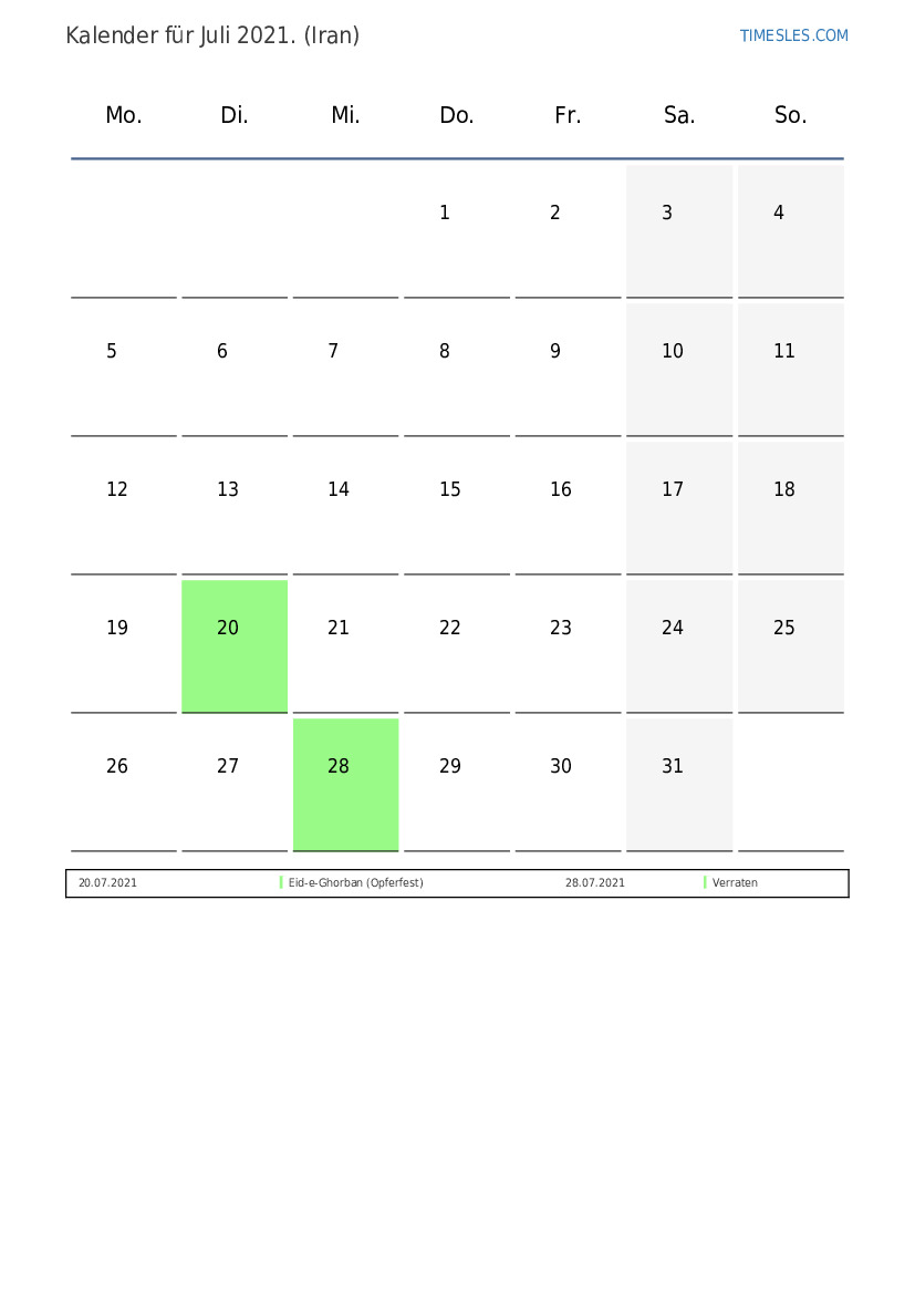 Laden Sie den PDF-Kalender mit Feiertagen und Wochenenden für Juli 2021 für den Iran herunter und drucken Sie ihn aus