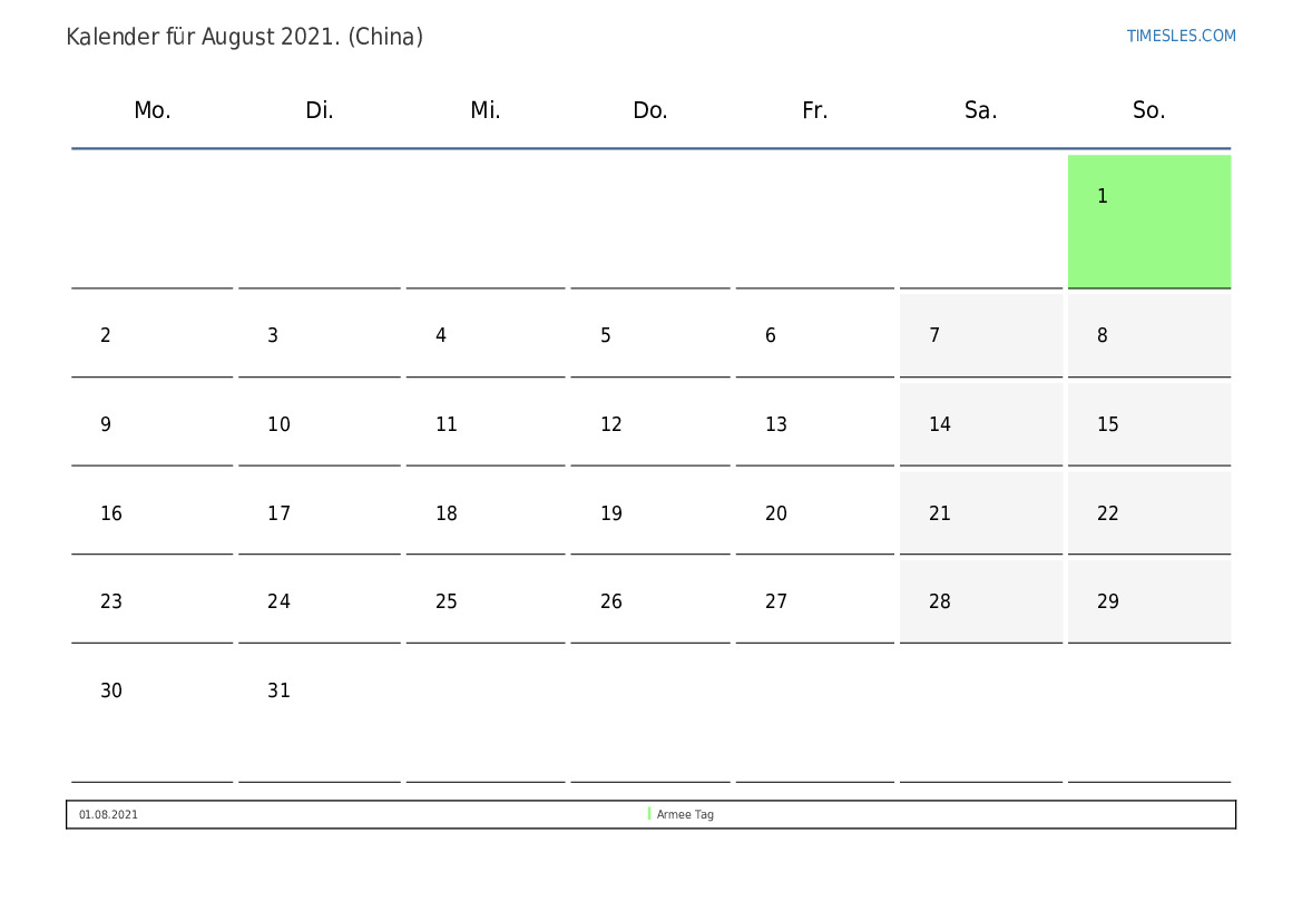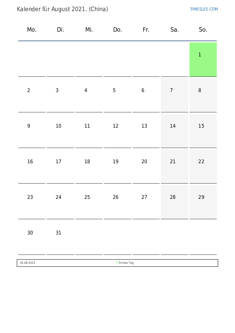 Laden Sie den PDF-Kalender mit Feiertagen und Wochenenden für August 2021 für China herunter und drucken Sie ihn aus