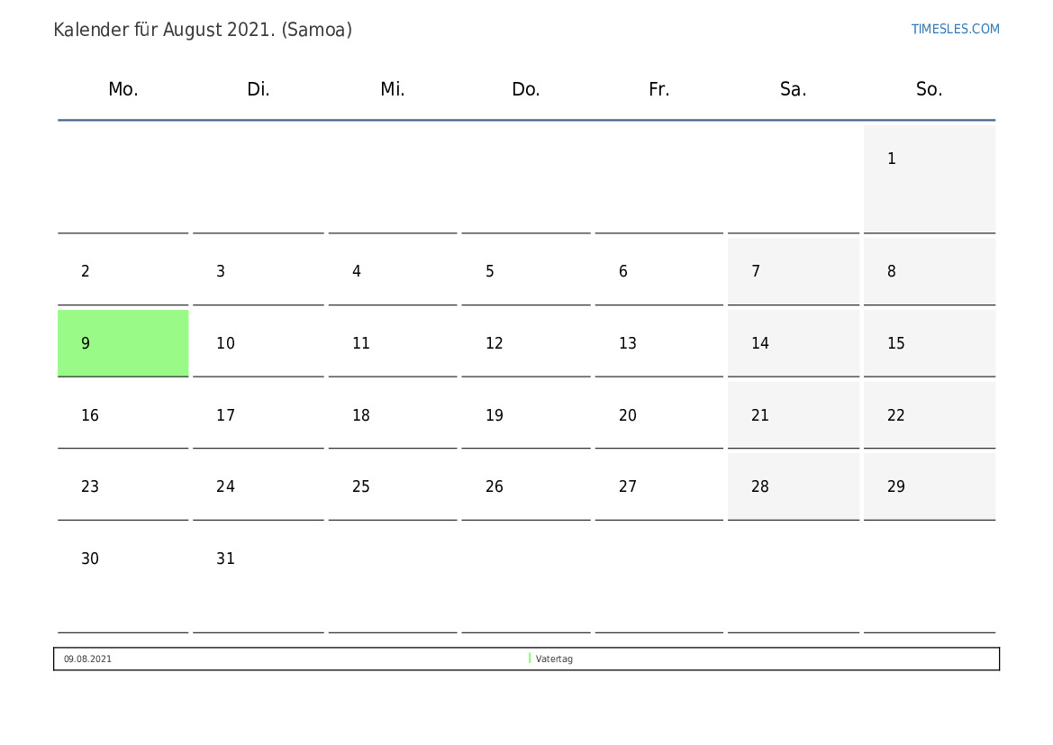 Feiertags- und Wochenendkalender für August 2021 für Samoa