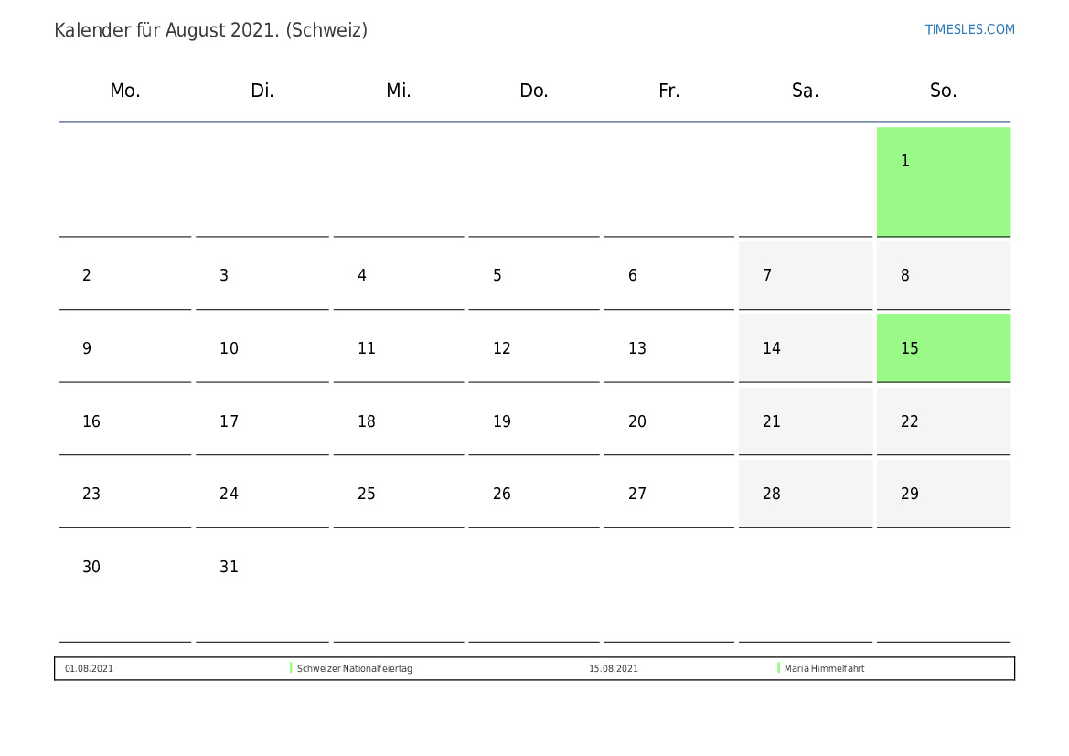 Laden Sie den PDF-Kalender mit Feiertagen und Wochenenden für August 2021 für die Schweiz herunter und drucken Sie ihn aus