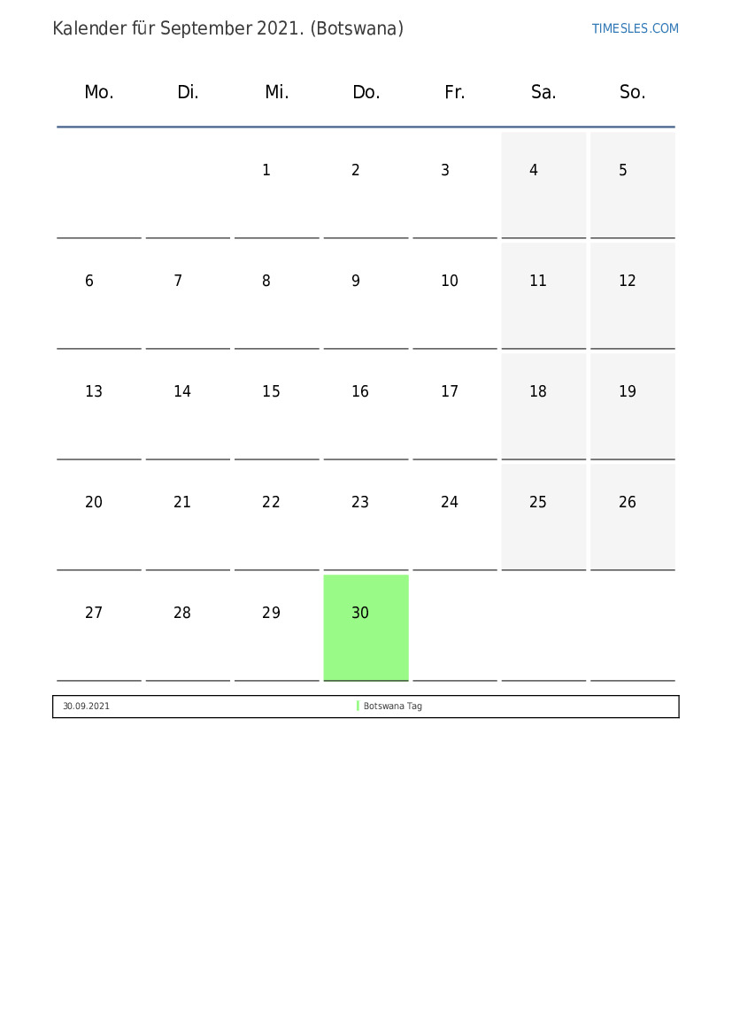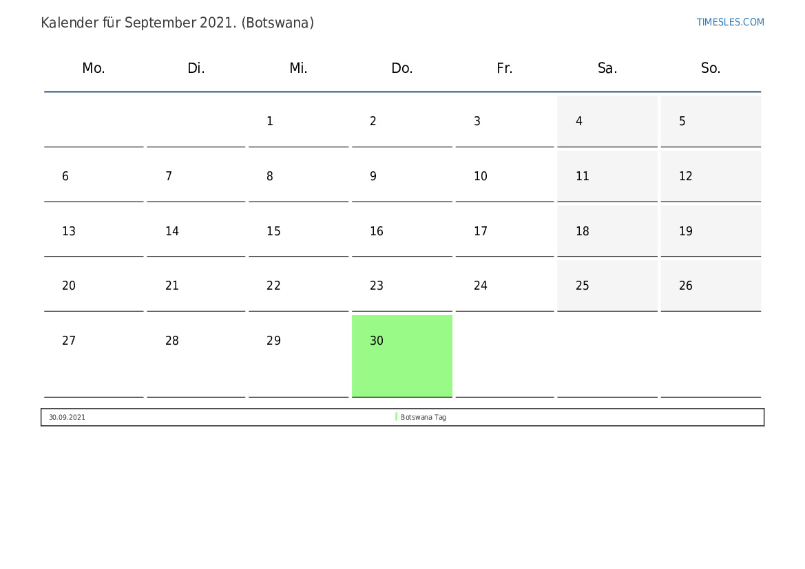 Laden Sie den PDF-Kalender mit Feiertagen und Wochenenden für September 2021 für Botswana herunter und drucken Sie ihn aus
