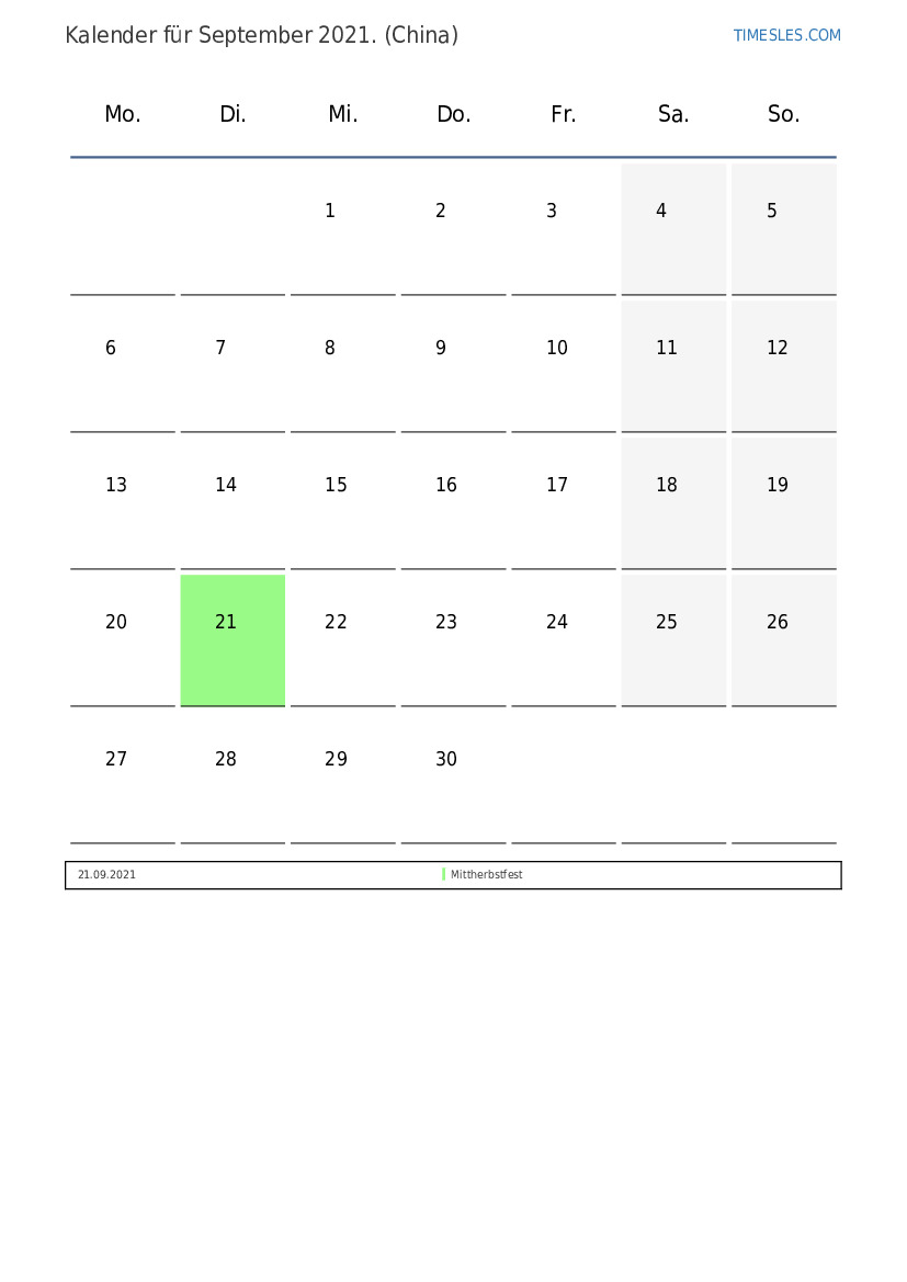 Laden Sie den PDF-Kalender mit Feiertagen und Wochenenden für September 2021 für China herunter und drucken Sie ihn aus