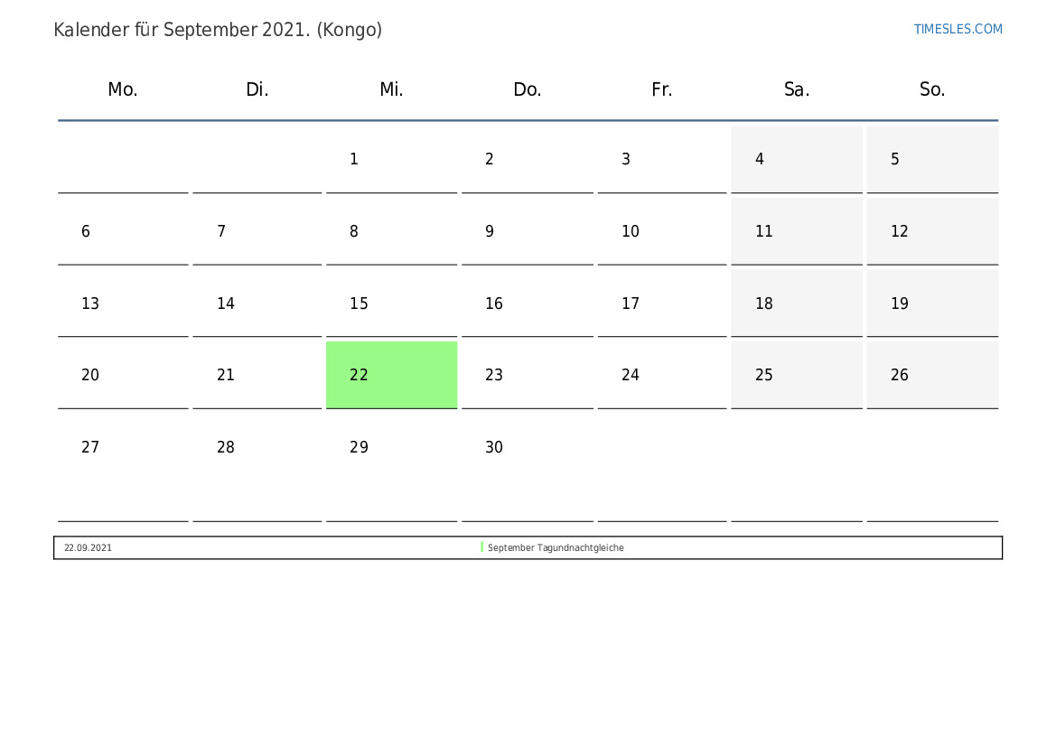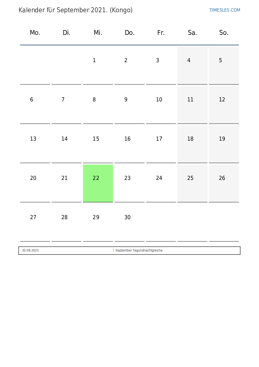 Der Monat September enthält 30 Tage. Dies ist 30 Tage Monat 2021. Jahreszeit: Herbst. Der Monat September beginnt am Mittwoch und endet am Donnerstag. Im September 2021 gibt es im Kongo 1 Feiertag und freier Tag.