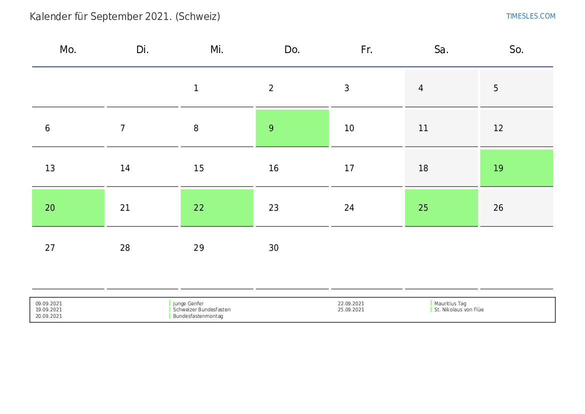 Laden Sie den PDF-Kalender mit Feiertagen und Wochenenden für September 2021 für die Schweiz herunter und drucken Sie ihn aus