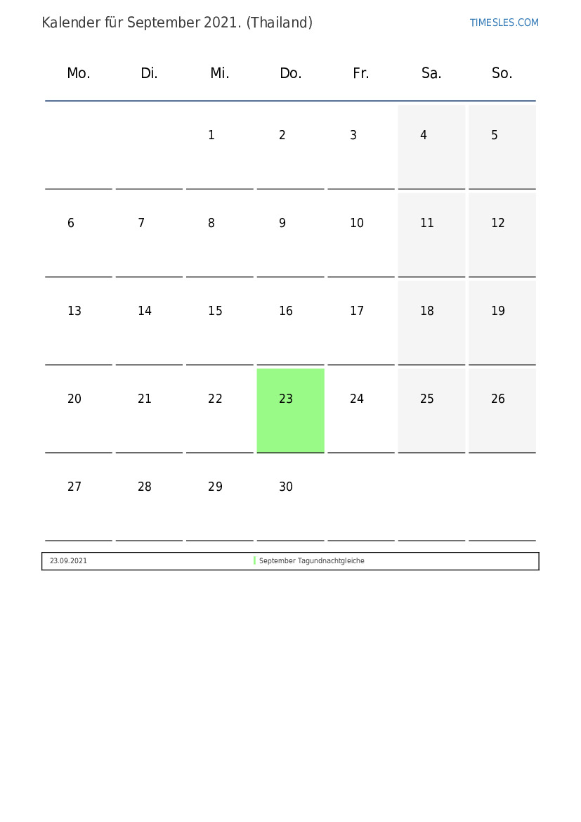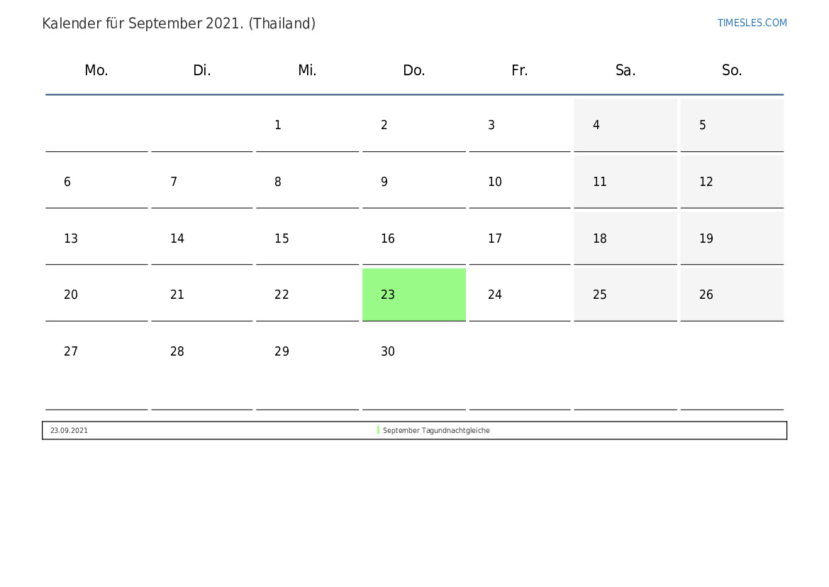Laden Sie den PDF-Kalender mit Feiertagen und Wochenenden für September 2021 für Thailand herunter und drucken Sie ihn aus