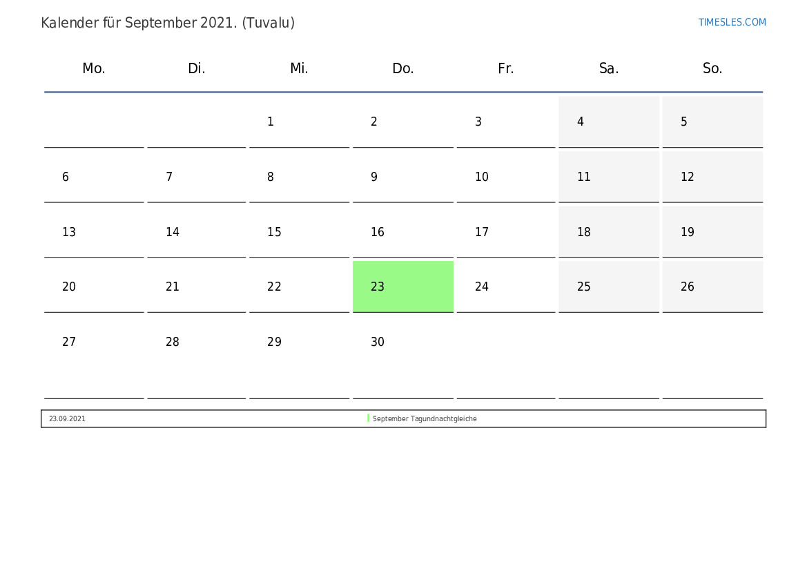 Laden Sie den PDF-Kalender mit Feiertagen und Wochenenden für September 2021 für Tuvalu herunter und drucken Sie ihn aus