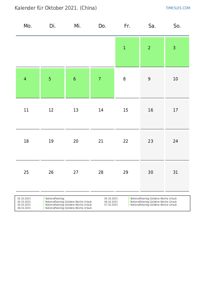 05.10.2021 Nationalfeiertag Goldene Woche Urlaub