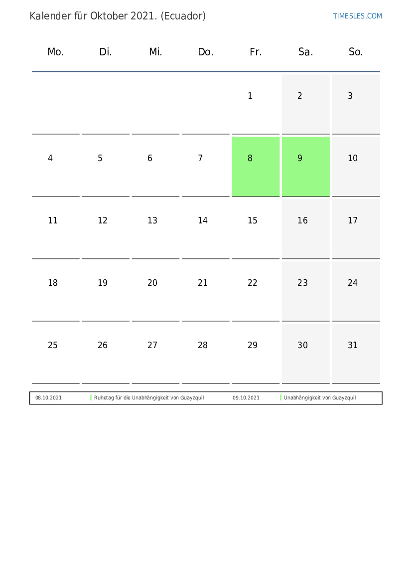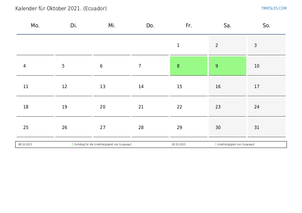 Feiertags- und Wochenendkalender für Oktober 2021 für Ecuador
