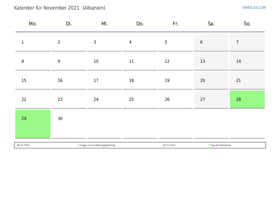 Laden Sie den PDF-Kalender mit Feiertagen und Wochenenden für November 2021 für Albanien herunter und drucken Sie ihn aus
