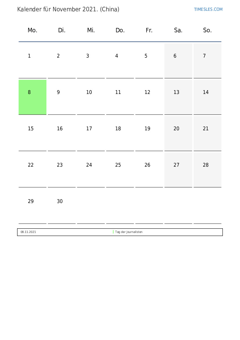 Laden Sie den PDF-Kalender mit Feiertagen und Wochenenden für November 2021 für China herunter und drucken Sie ihn aus