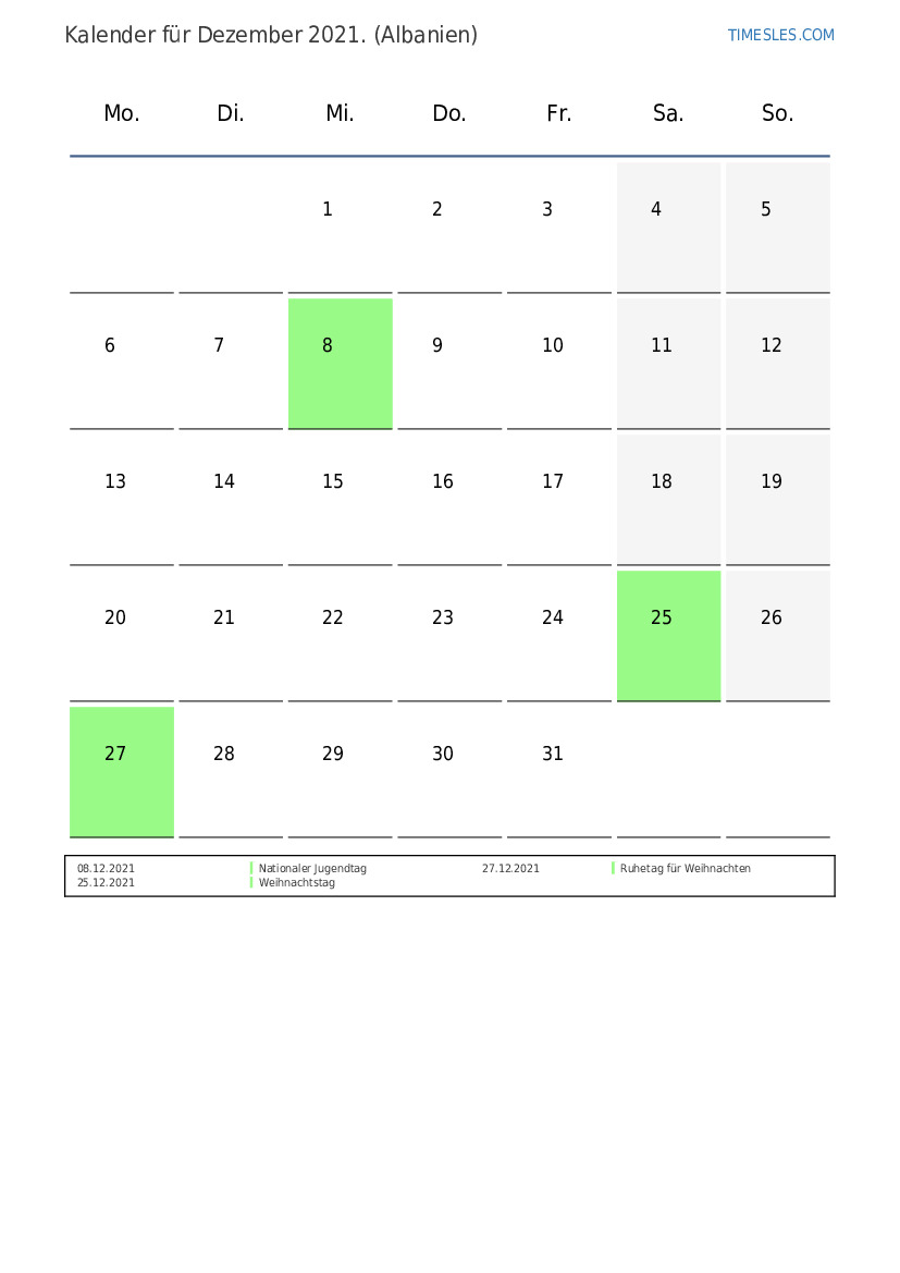 Laden Sie den PDF-Kalender mit Feiertagen und Wochenenden für Dezember 2021 für Albanien herunter und drucken Sie ihn aus