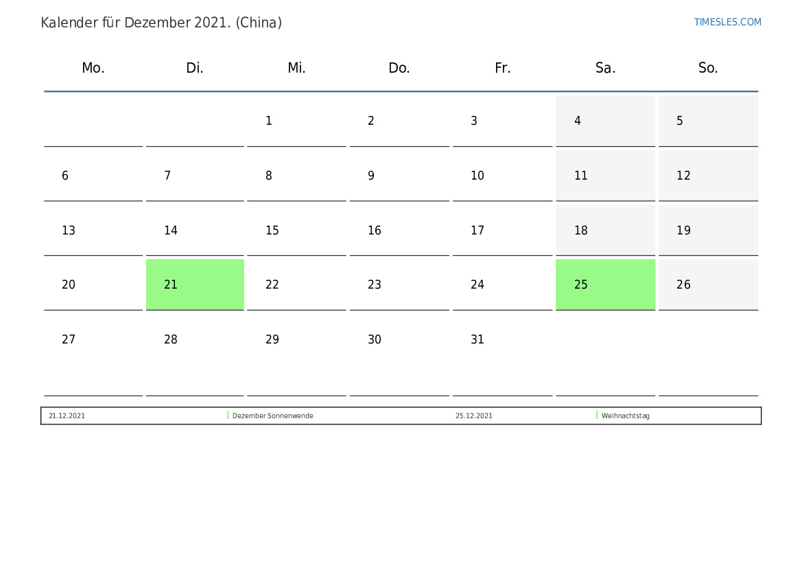 Feiertags- und Wochenendkalender für Dezember 2021 für China