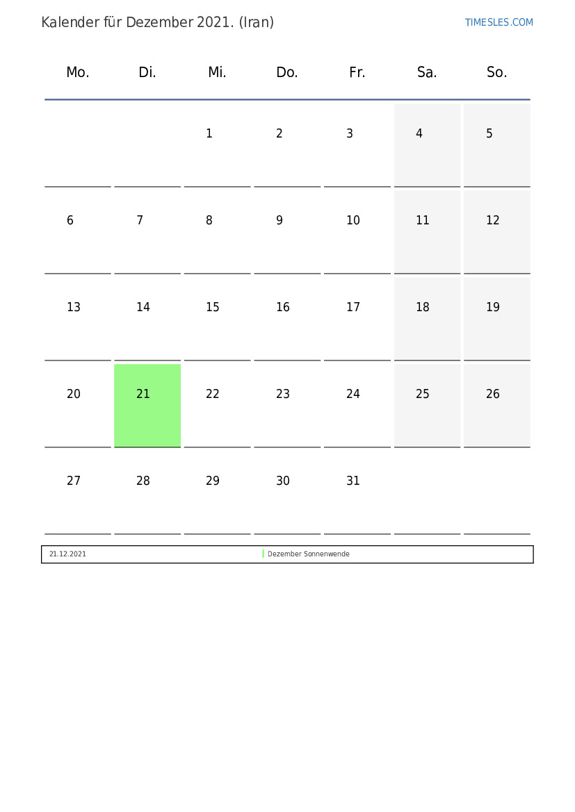 Laden Sie den PDF-Kalender mit Feiertagen und Wochenenden für Dezember 2021 für den Iran herunter und drucken Sie ihn aus