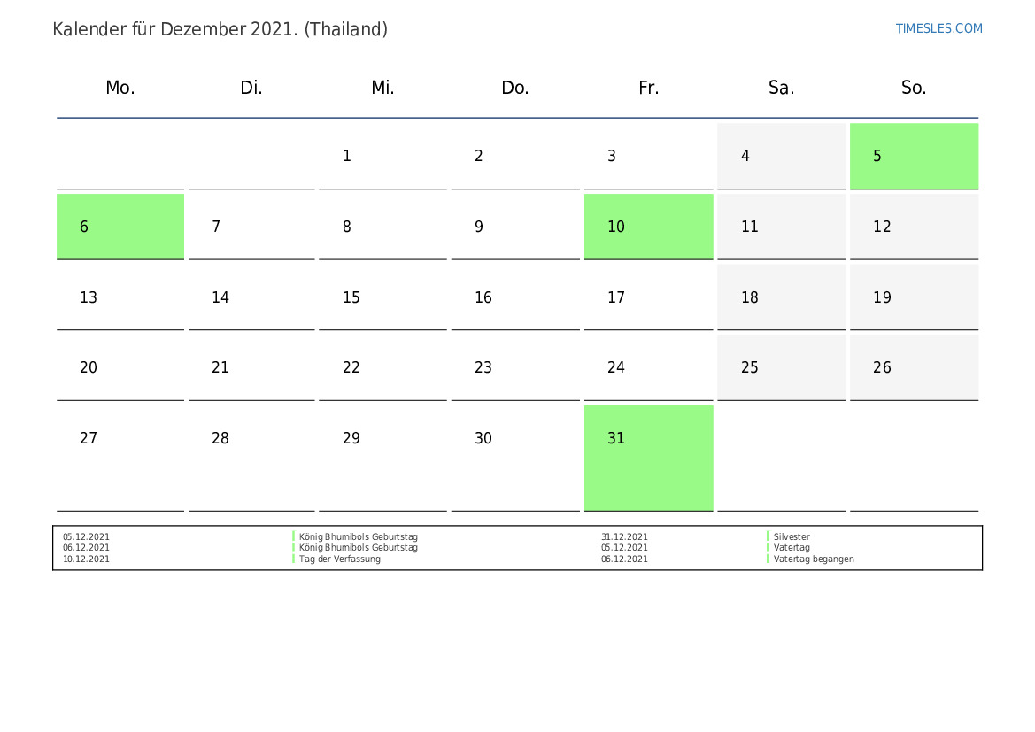 Laden Sie den PDF-Kalender mit Feiertagen und Wochenenden für Dezember 2021 für Thailand herunter und drucken Sie ihn aus