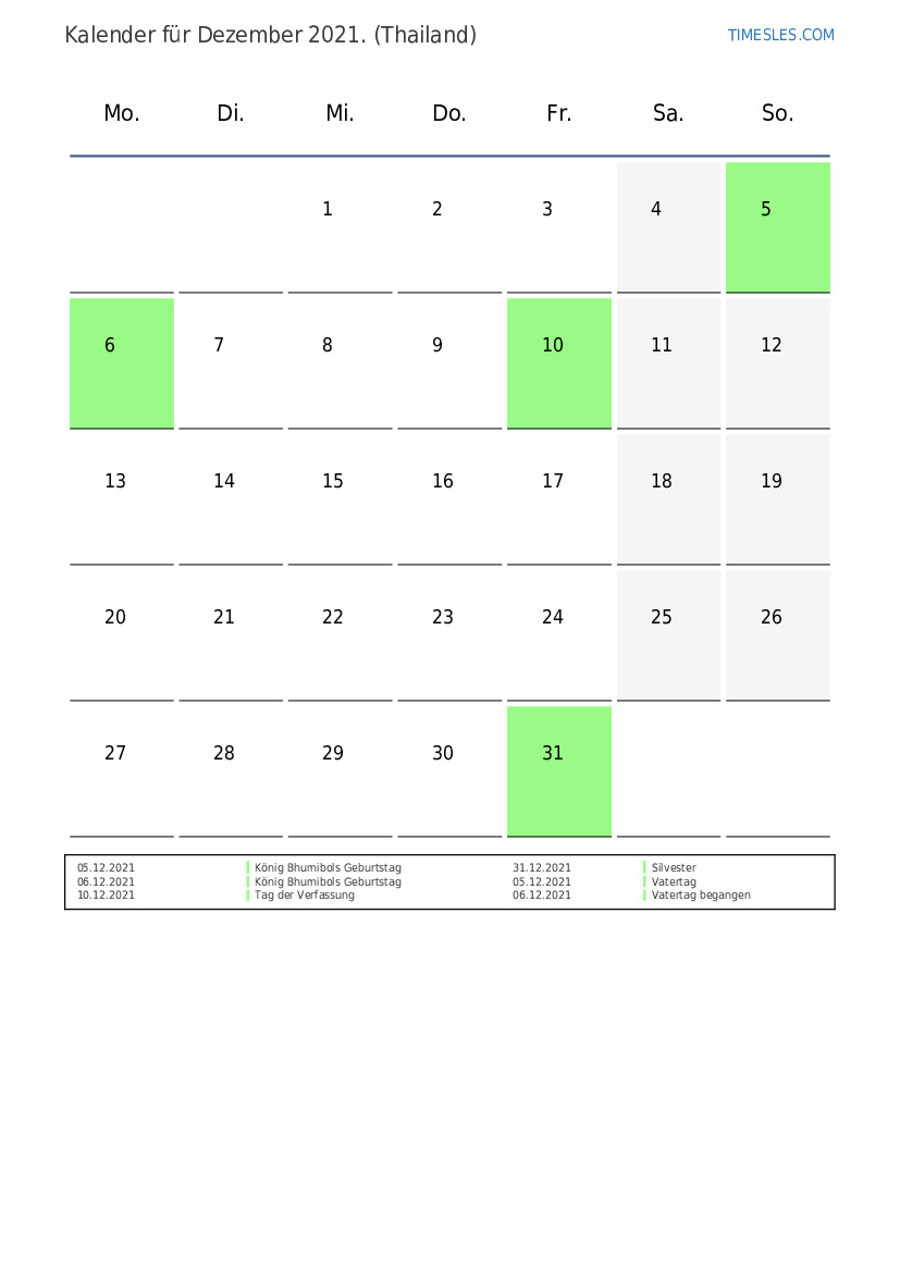 Der Monat Dezember enthält 31 Tage. Dies ist 31 Tage Monat 2021. Jahreszeit: Winter. Der Monat Dezember beginnt am Mittwoch und endet am Freitag. Im Dezember 2021 gibt es in Thailand 9 Feiertage und freie Tage.