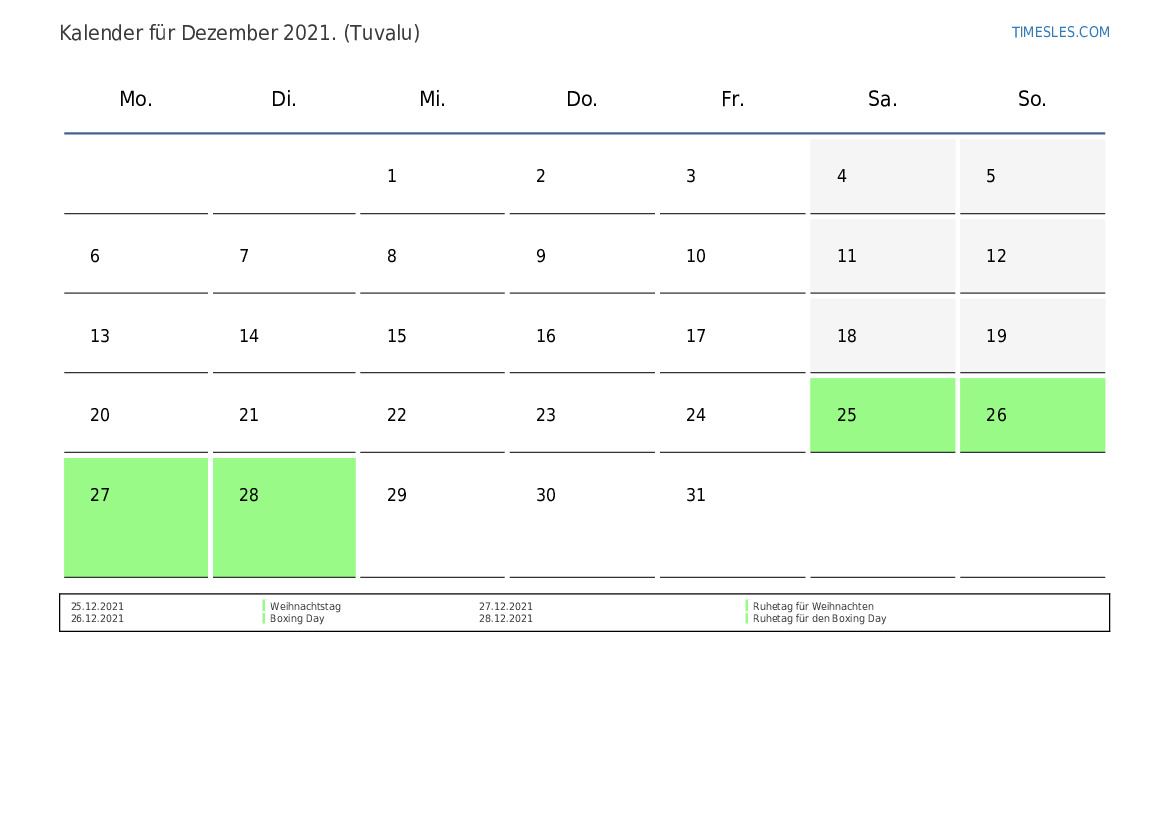 Feiertags- und Wochenendkalender für Dezember 2021 für Tuvalu