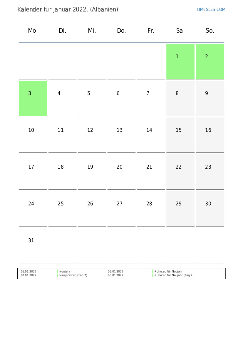Feiertags- und Wochenendkalender für Januar 2022 für Albanien
