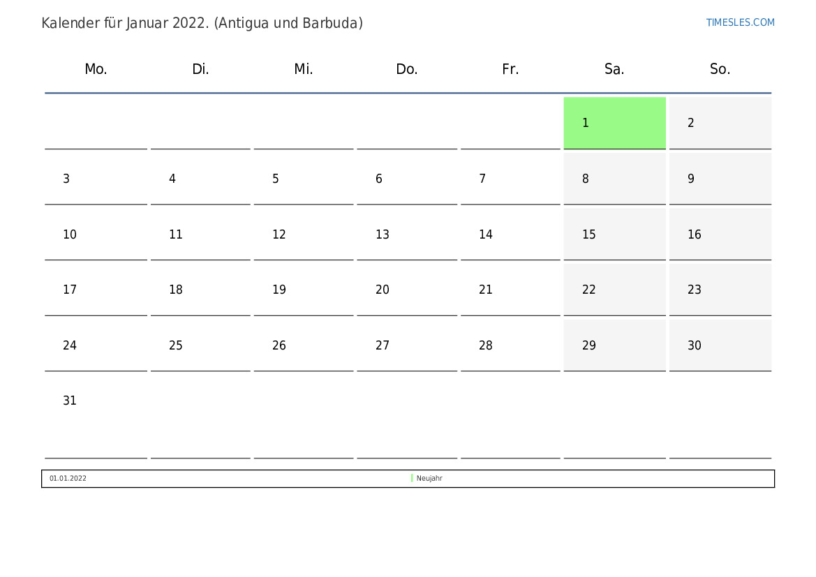 Der Monat Januar enthält 31 Tage. Dies ist 31 Tage Monat 2022. Jahreszeit: Winter. Der Monat Januar beginnt am Samstag und endet am Montags. Im Januar 2022 gibt es in Antigua und Barbuda 1 Feiertag und freier Tag.