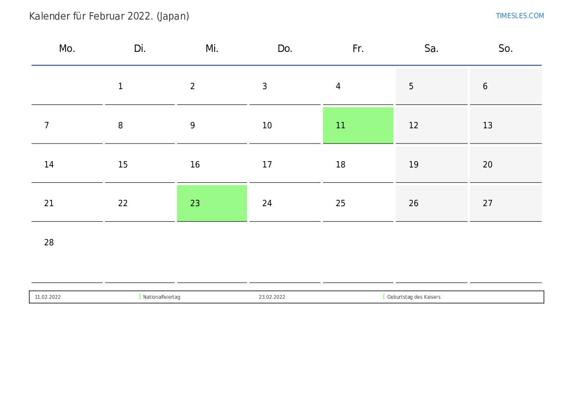 Der Monat Februar enthält 28 Tage. Dies ist 28 Tage Monat 2022. Jahreszeit: Winter. Der Monat Februar beginnt am Dienstag und endet am Montags. Im Februar 2022 gibt es in Japan 3 Feiertage und freie Tage.