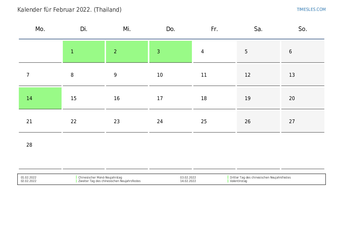 Der Monat Februar enthält 28 Tage. Dies ist 28 Tage Monat 2022. Jahreszeit: Winter. Der Monat Februar beginnt am Dienstag und endet am Montags. Im Februar 2022 gibt es in Thailand 4 Feiertage und freie Tage.