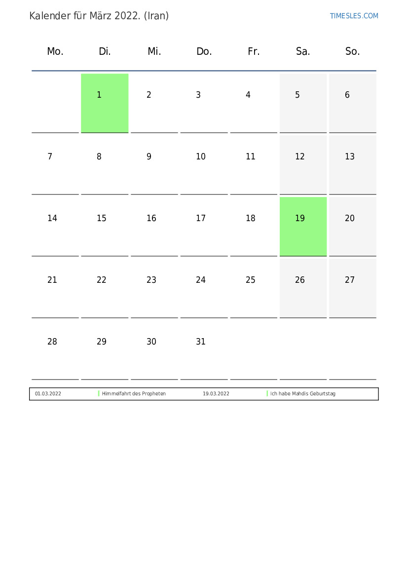 Laden Sie den PDF-Kalender mit Feiertagen und Wochenenden für März 2022 für den Iran herunter und drucken Sie ihn aus