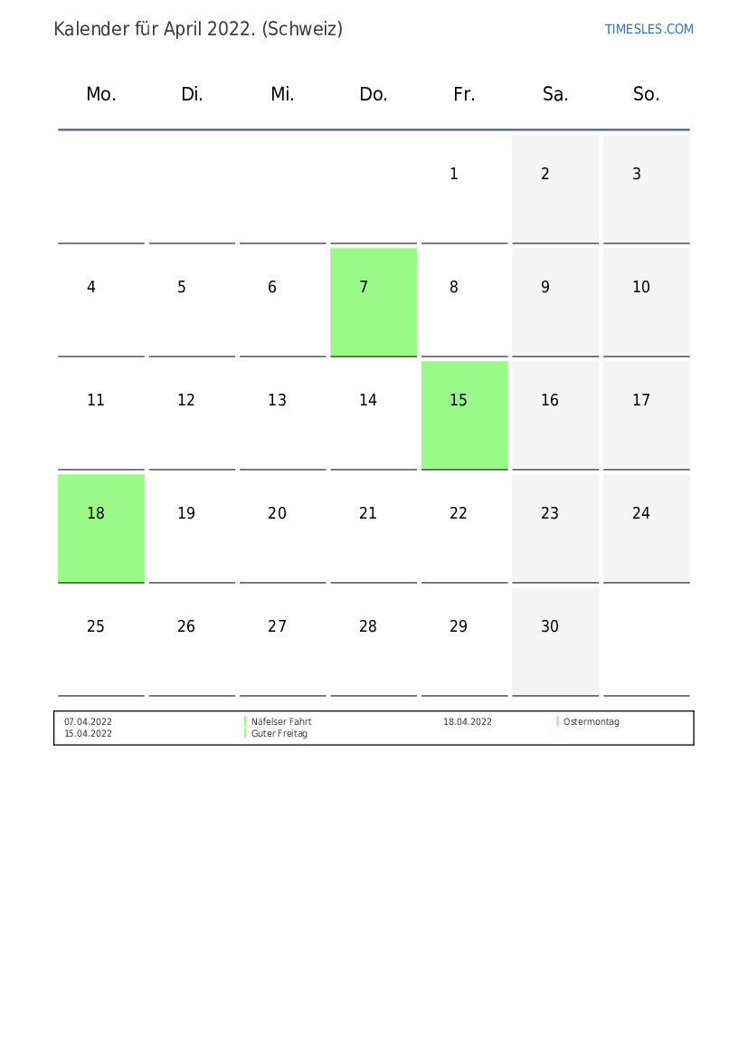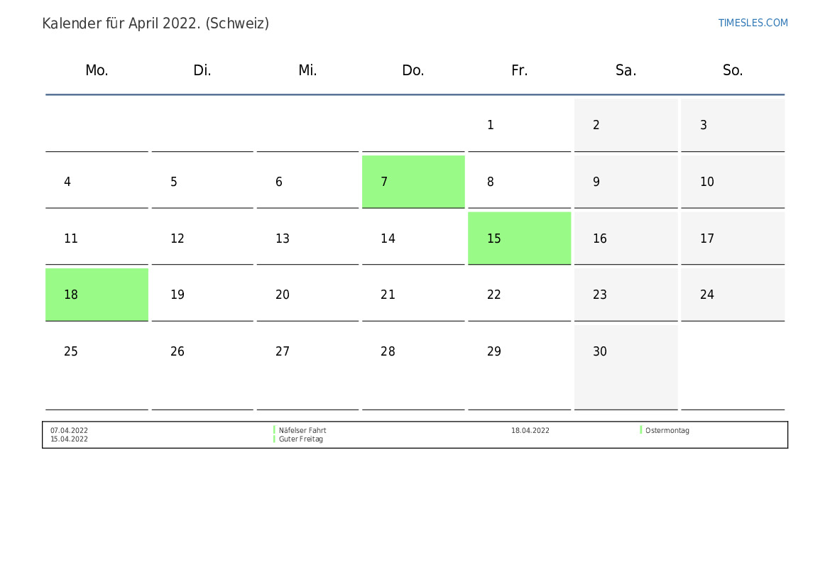 Laden Sie den PDF-Kalender mit Feiertagen und Wochenenden für April 2022 für die Schweiz herunter und drucken Sie ihn aus