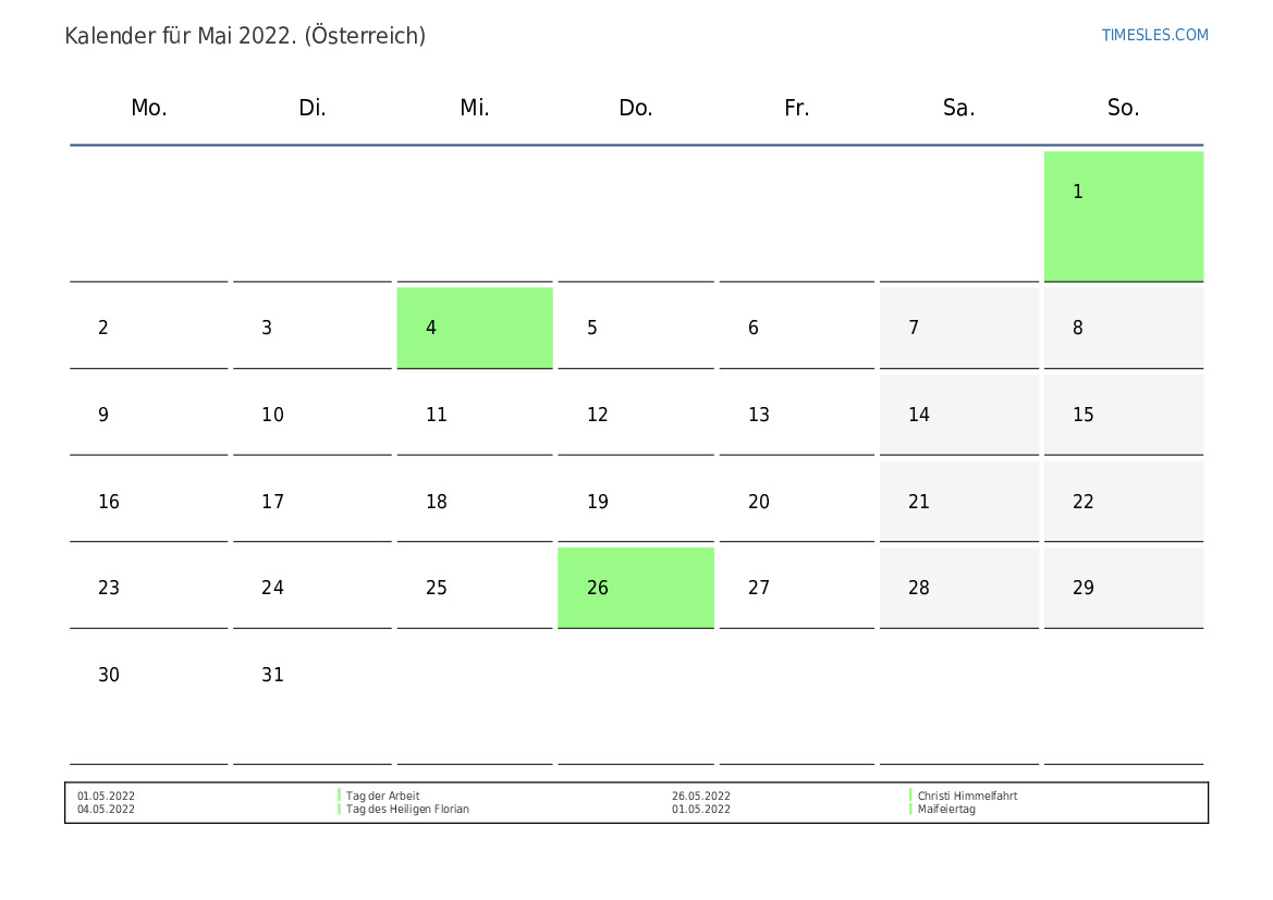 Der Monat Mai enthält 31 Tage. Dies ist 31 Tage Monat 2022. Jahreszeit: Frühling. Der Monat Mai beginnt am Sonntag und endet am Dienstag. Im Mai 2022 gibt es in Österreich 4 Feiertage und freie Tage.