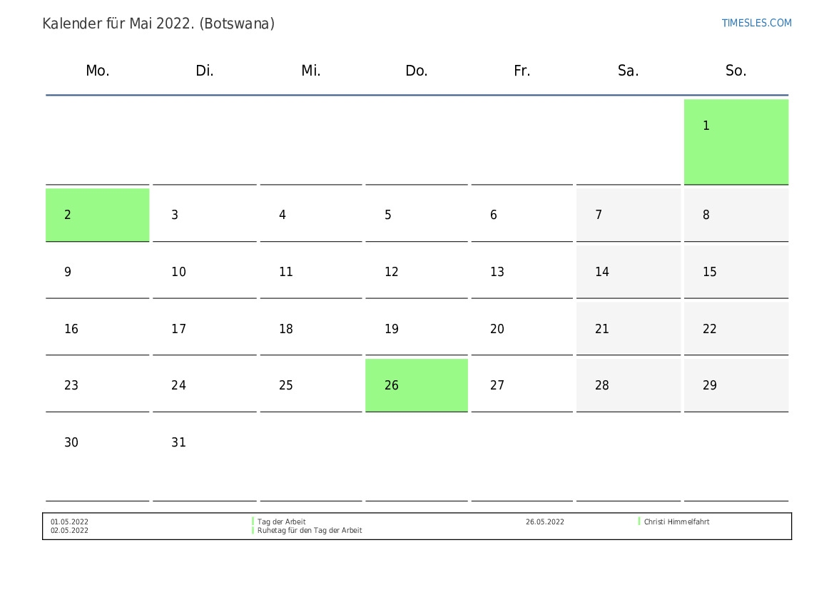 Laden Sie den PDF-Kalender mit Feiertagen und Wochenenden für Mai 2022 für Botswana herunter und drucken Sie ihn aus