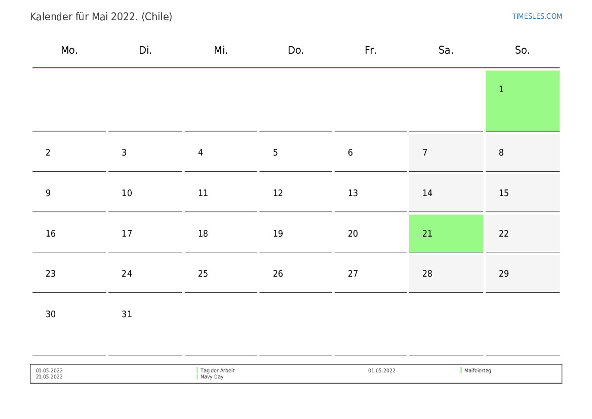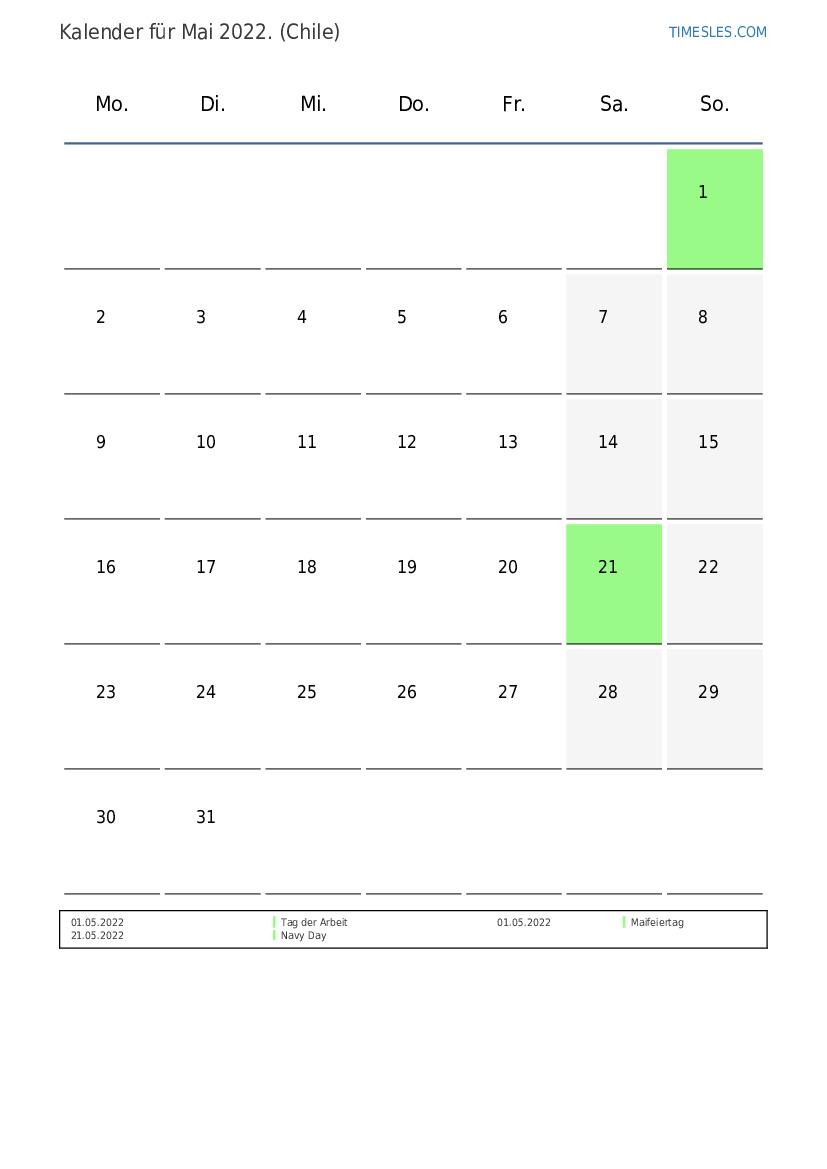 Feiertags- und Wochenendkalender für Mai 2022 für Chile