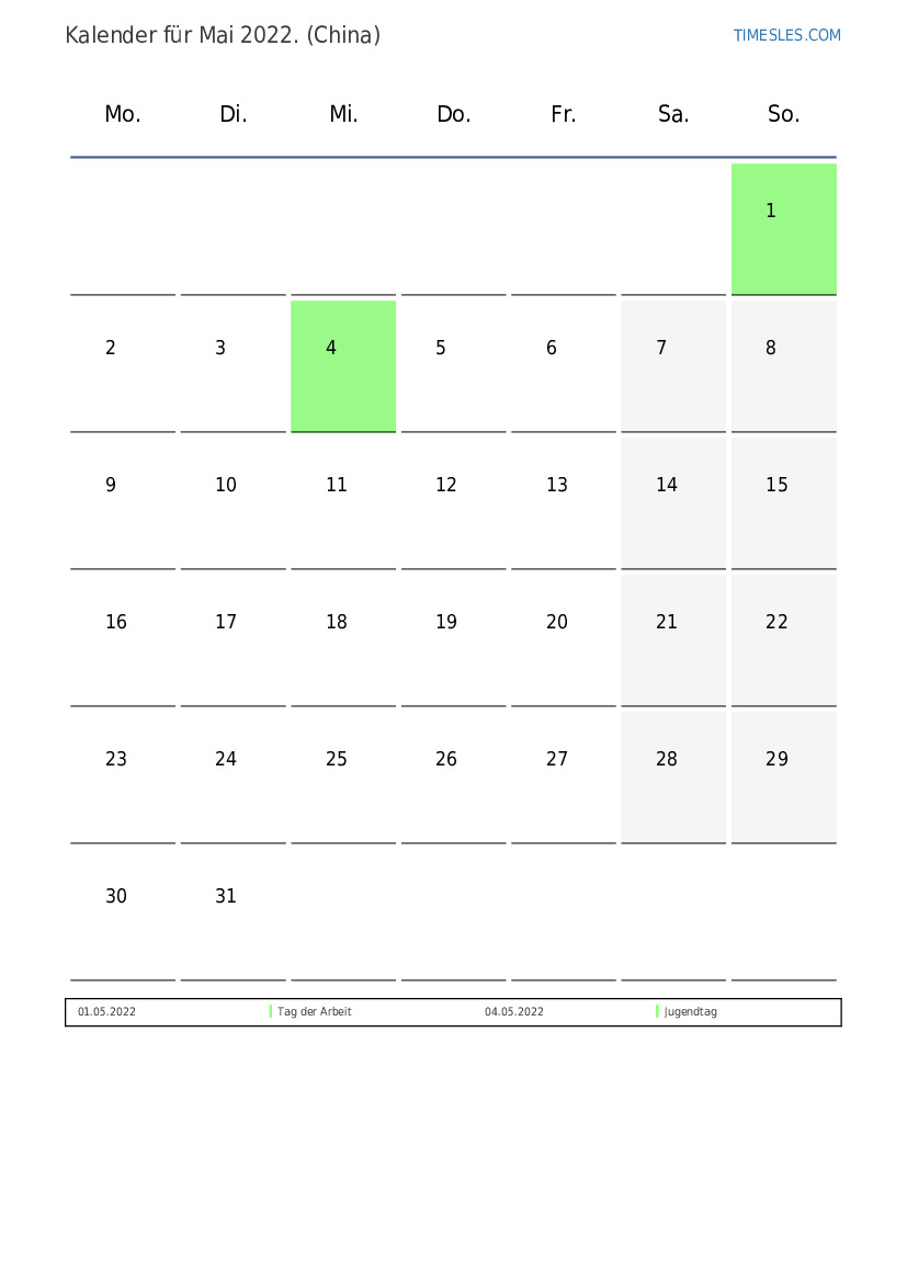 Feiertags- und Wochenendkalender für Mai 2022 für China