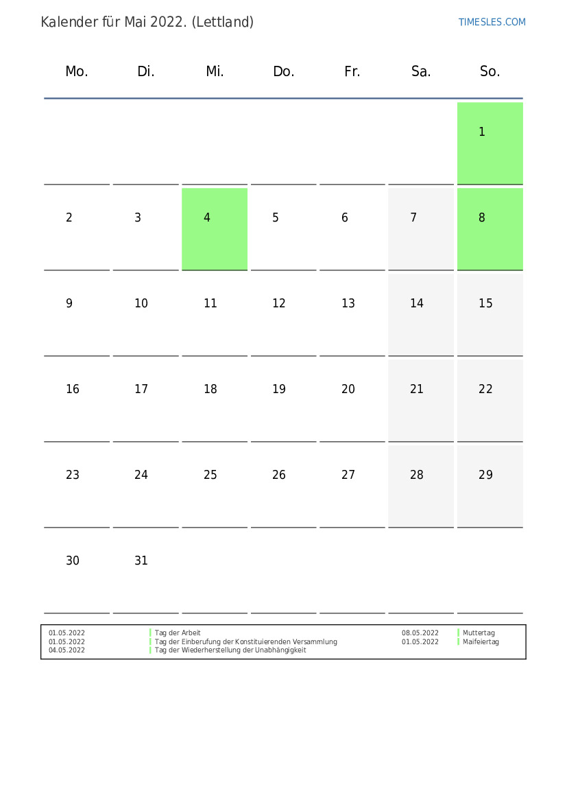 Feiertags- und Wochenendkalender für Mai 2022 für Lettland