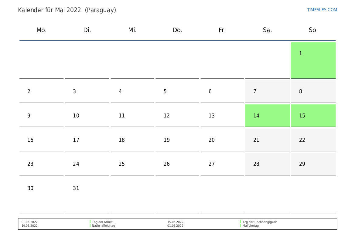 Feiertags- und Wochenendkalender für Mai 2022 für Paraguay