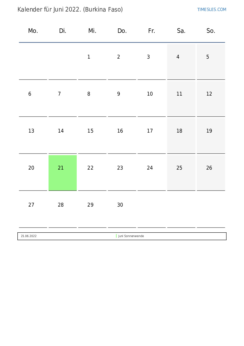 Laden Sie den PDF-Kalender mit Feiertagen und Wochenenden für Juni 2022 für Burkina Faso herunter und drucken Sie ihn aus